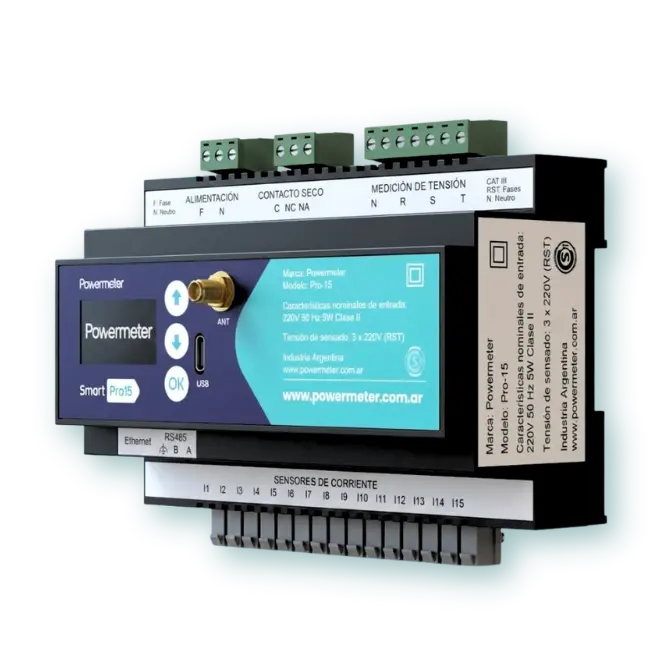 El medidor Powermeter Smart Pro15 permite monitorear energía trifásica en hasta 15 circuitos simultáneos, lo que equivale a tener 5 medidores trifásicos en un solo dispositivo compacto. Cuenta con conectividad WiFi, LTE, NB-IoT y LoRaWAN, lo que facilita su integración con plataformas como Powermate o sistemas SCADA industriales.